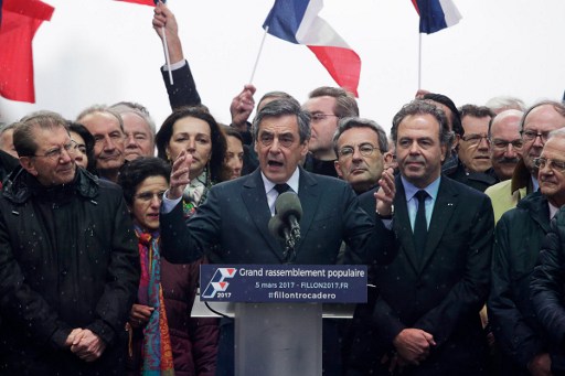 Embattled French conservative Francois Fillon told supporters at a Paris rally on March 5, 2017 to “never give up the fight” as he strives to stay in the presidential election race amid an expenses scandal. Fillon, who is to be charged over claims he gave his wife and children highly-paid fake parliamentary jobs, told the rain-drenched crowd he had been “attacked by everyone” in the campaign.