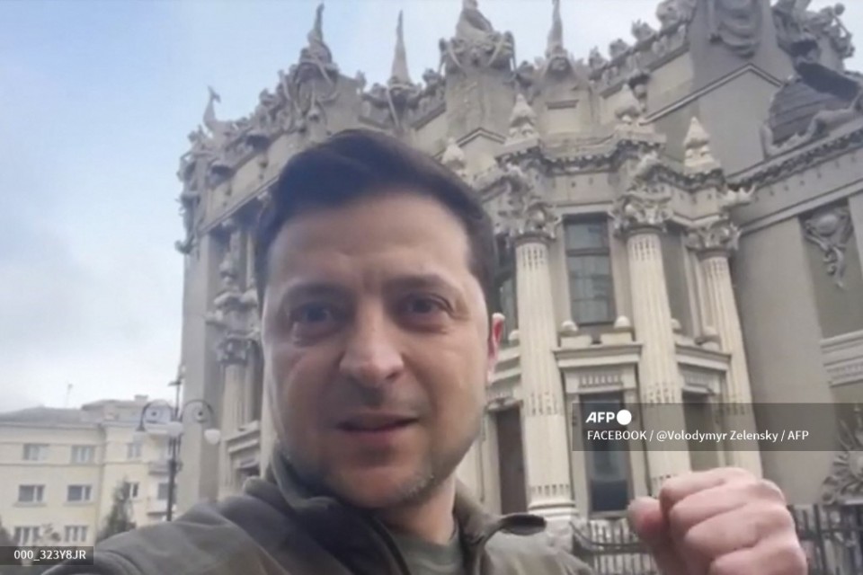 This screen grab taken from a video made available on the Facebook account of the President of Ukraine Volodymyr Zelensky, shows himself speaking face camera on February 26, 2022. – After Ukrainian forces said they had repulsed a Russian attack on their capital on February 26, President Volodymyr Zelensky shot a selfie-style video to vow to stay and fight on. “I am here. We will not lay down any weapons. We will defend our state, because our weapons are our truth,” he declared, denouncing as disinformation claims that he had surrendered or fled. (Photo by FACEBOOK / @Volodymyr Zelensky / AFP)