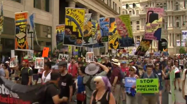 Thousands of protesters took to the streets of downtown Philadelphia to voice their displeasure over the treatment Bernie Sanders received from the DNC and were happy to hear Wasserman Schultz had resigned her post.