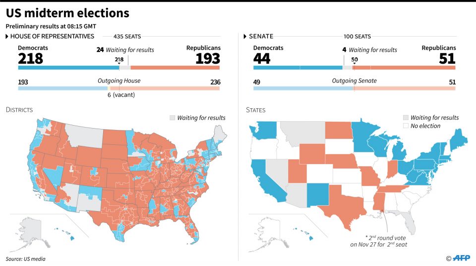 WASHINGTON, United States (AFP) — Democrats seized control of the House of Representatives on Tuesday in a midterm setback for Donald Trump, but the US president managed to avoid a feared “blue wave” as his Republican Party expanded its Senate majority after a polarizing, racially charged campaign.