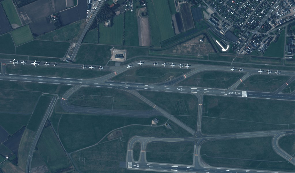 This handout satellite image released by Maxar Technologies shows a lineup of parked planes at Copenhagen Airport, in Copenhagen, Denmark, on March 26, 2020, during the coronavirus (Covid-19) outbreak. – (Photo by Satellite image ©2020 Maxar Technologies / AFP)