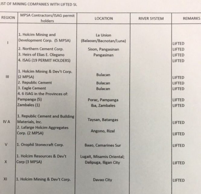 In Region 3 or Central Luzon: Holcim Mining and Development Corp., Republic Cement, Eagle Cement, all in Bulacan; and six firms with ISAG in Pampanga and Zambales;