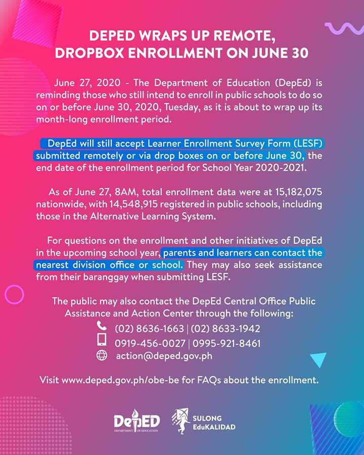 The Department of Education issued the reminder as it urged parents to submit the Learner Enrollment Survey Form on or before the date, the end date of the enrollment period for school year 2020 to 2021.