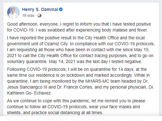 (Eagle News) — Deputy Speaker and Misamis Occidental Rep. Henry Oaminal has tested positive for COVID-19.