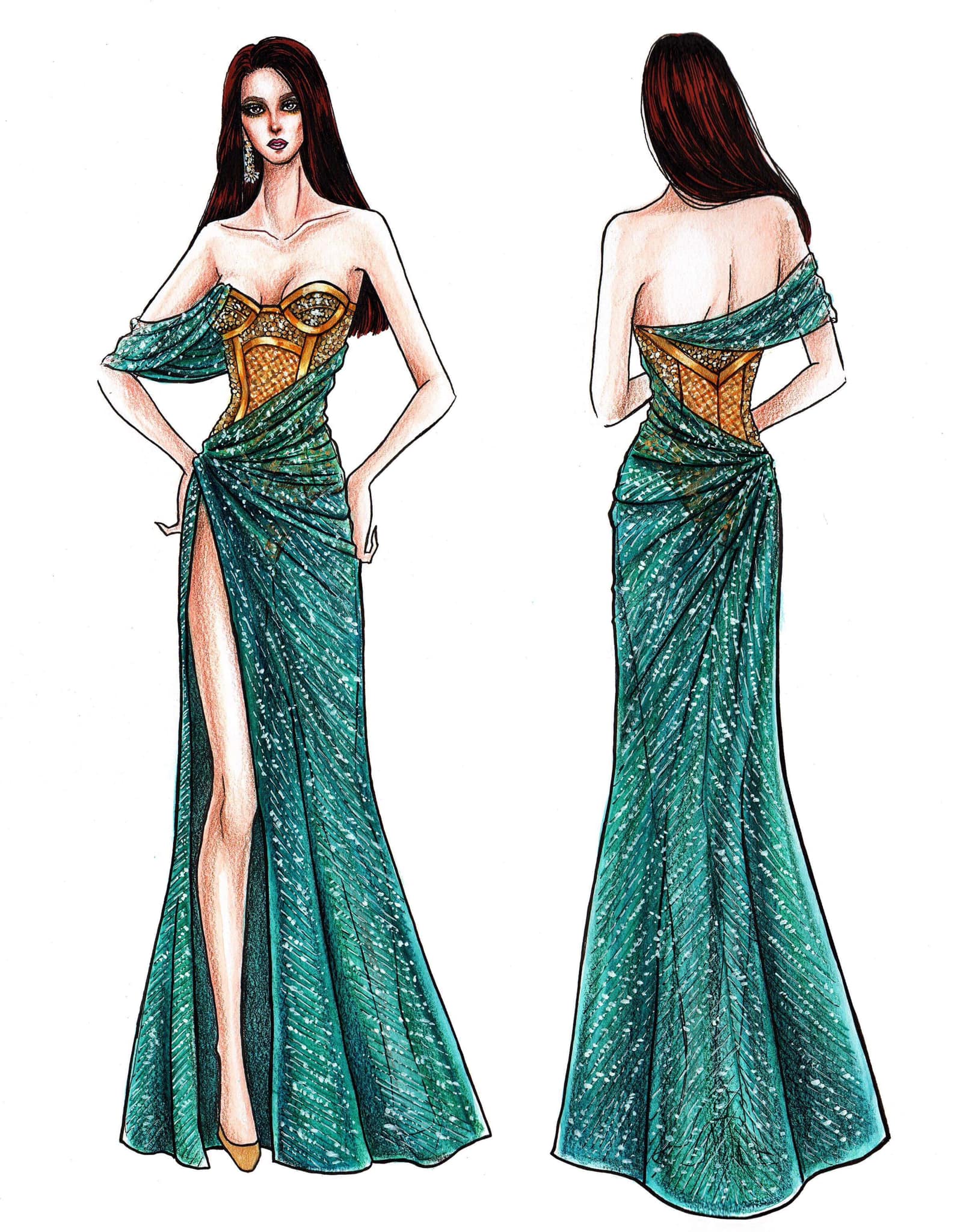 (Eagle News)—These are sketches of what designer Mak Tumang said was among the dresses Catriona Gray planned to wear at the Miss Universe 2018 pageant in Thailand. Tumang, who posted the sketches on his Facebook account, said the piece was an “extolment” of the Philippines, also called the pearl of the Orient seas.