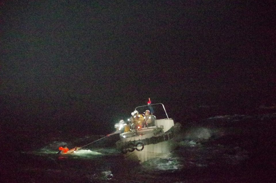 Dramatic photos and video released by the coast guard showed the man floating in the darkness in an orange life jacket and being pulled onto a boat with a rope as rescuers battled violent, rolling waves.