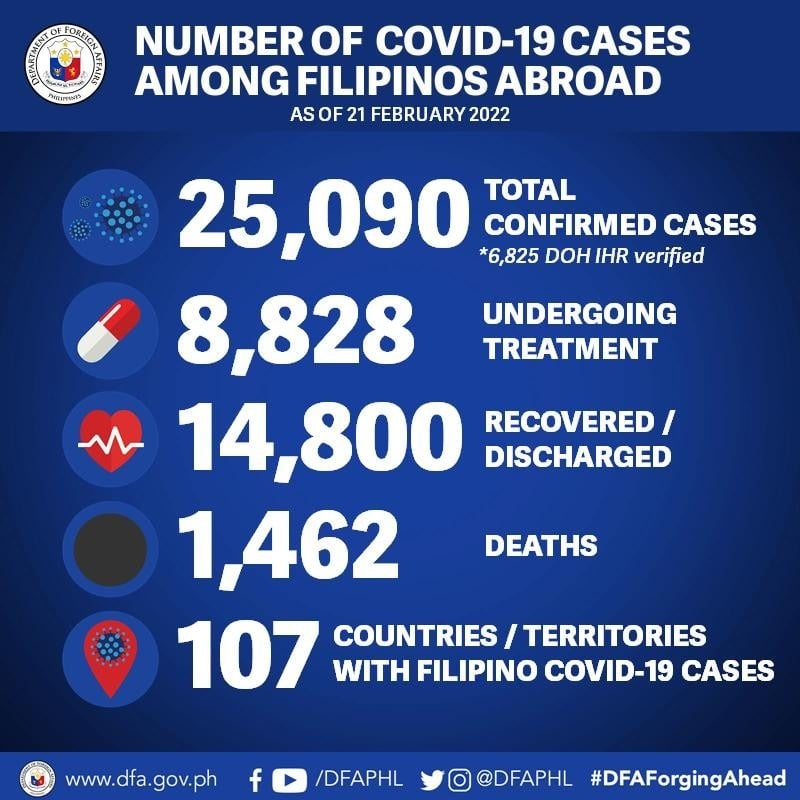 According to the Department of Foreign Affairs, the 25,090 total COVID-19 cases were after 115 more COVID-19 cases were reported among Filipinos outside the country.