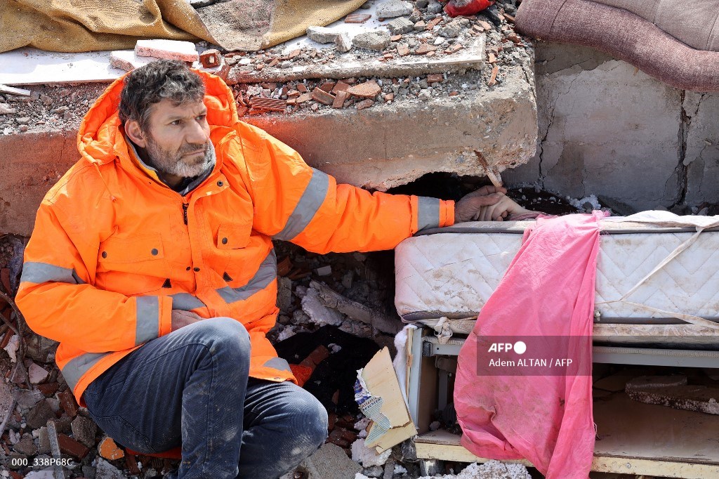 Mesut Hancer holds the hand of his 15-year-old daughter Irmak, who died in the earthquake in Kahramanmaras, close to the quake’s epicentre, the day after a 7.8-magnitude earthquake struck the country’s southeast, on February 7, 2023. – Rescuers in Turkey and Syria braved frigid weather, aftershocks and collapsing buildings, as they dug for survivors buried by an earthquake that killed more than 5,000 people. Some of the heaviest devastation occurred near the quake’s epicentre between Kahramanmaras and Gaziantep, a city of two million where entire blocks now lie in ruins under gathering snow. (Photo by Adem ALTAN / AFP)