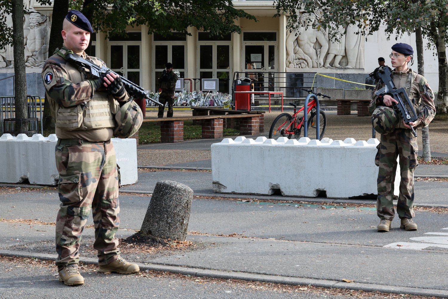 French military servicemen of ongoing French military operation “Operation Sentinelle” stand guard in front of the Gambetta high school during its’ evacuation after a bomb threat in Arras, northeastern France on October 16, 2023, three days after a teacher was killed and two other people were severely wounded on October 13, in a knife attack at the Gambetta high school. – The Gambetta high school of Arras was evacuated after a bomb threat, an AFP jousnalist reported on October 16, just days after a man of Chechen origin stabbed to death a teacher and severely wounded two other adults on October 13 at a school in northeastern France, with prosectors opening a probe into a suspected act of terror. (Photo by Denis Charlet / AFP)
