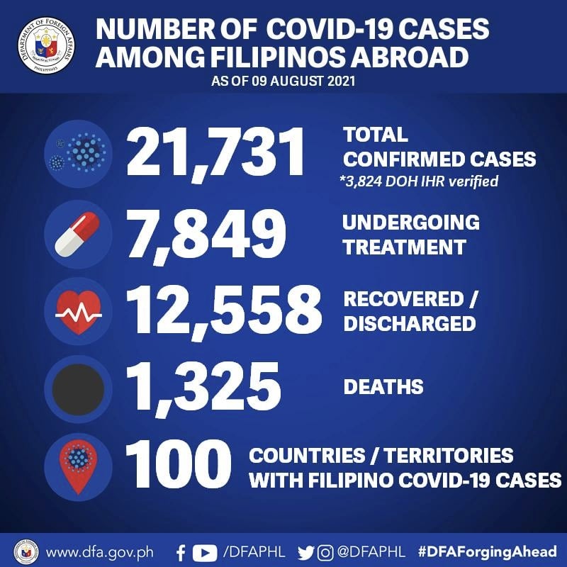 The Department of Foreign Affairs said the additional cases pushed the COVID-19 cases among Filipinos abroad 21731.