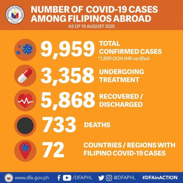 An additional 26 Filipinos overseas contracted COVID-19, bringing the total to 9959, the DFA said./DFA/