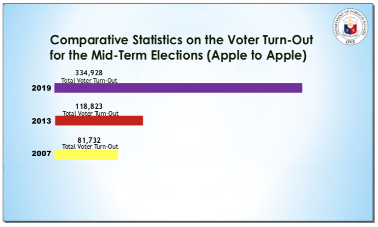 The 2019 National and Local Elections had its share of challenges, most notably with the vote counting machines and SD cards. Overseas, there had also been additional issues with regards to the mailing of ballots to registered voters. But despite the numerous difficulties on the conduct and management of elections overseas, the men and women of the Philippine Foreign Service have successfully ushered a voter turnout of 334,928. This makes it the highest voter turnout for a midterm election and is second only to the 2016 Presidential elections (which had a total overseas voter turnout of 432,706) since the Overseas Voting Act was signed into law in 2003. Similarly, this high turnout sustains the momentum coming from the 2016 Presidential election cycle and will hopefully continue to set new milestones for the 2022 elections.