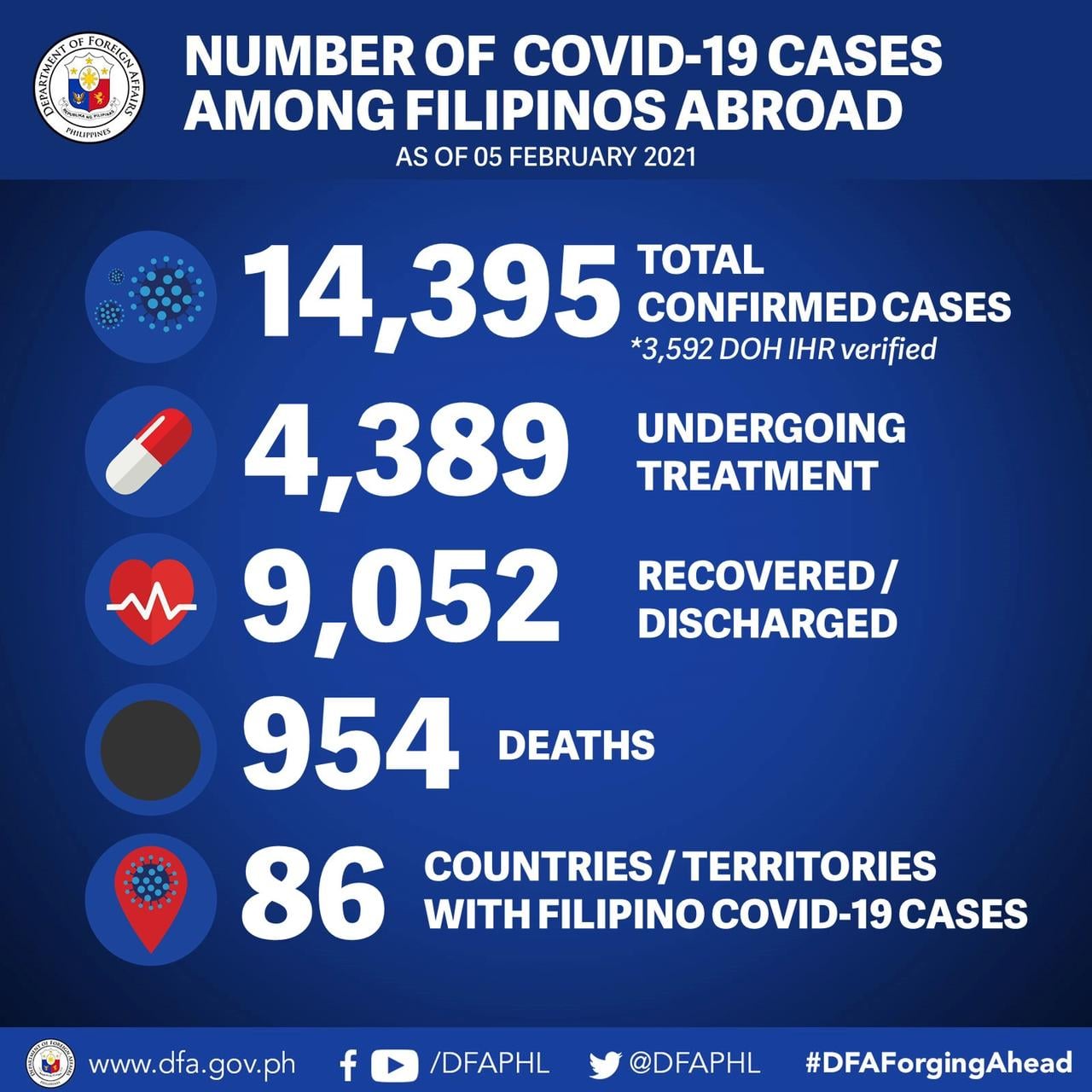 The DFA said this was after six additional cases were reported among overseas Filipinos as of Friday, Feb. 5.
