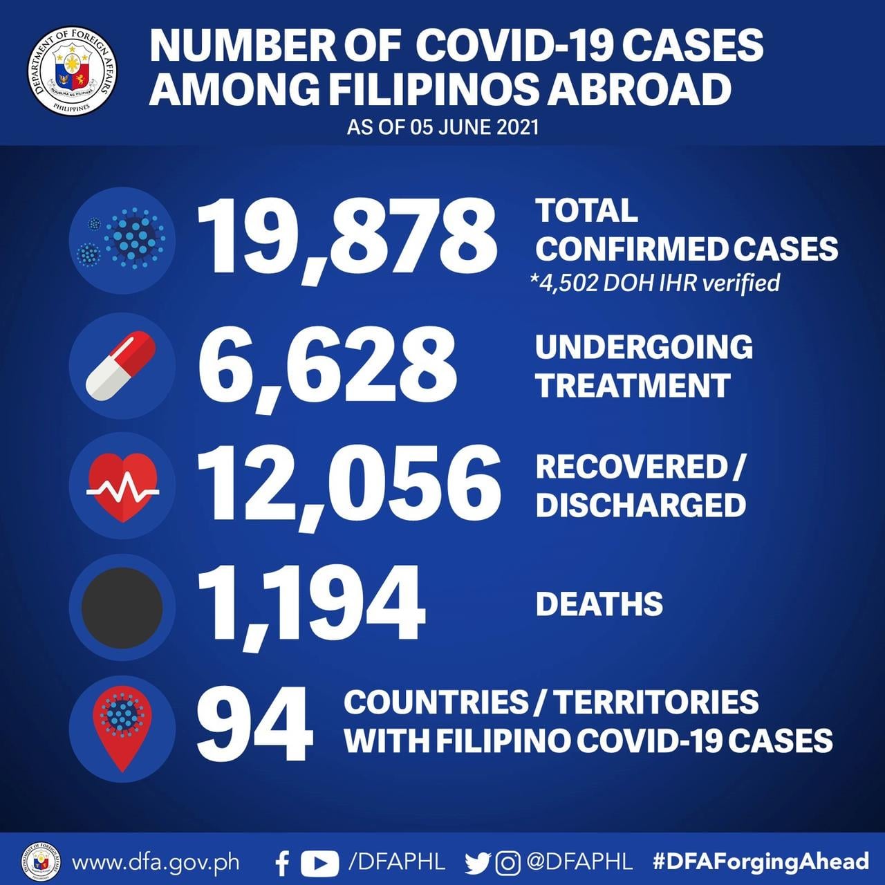 According to recent Department to Foreign Affairs data, three additional recoveries also pushed the COVID-19 recoveries among Filipinos abroad to 12056.