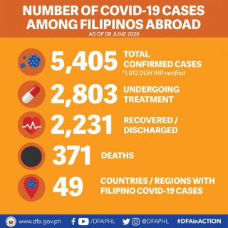 (Eagle News)–The Department of Foreign Affairs on Monday, June 8, said there were no new recoveries recorded today among overseas Filipinos who contracted the COVID-19 virus.