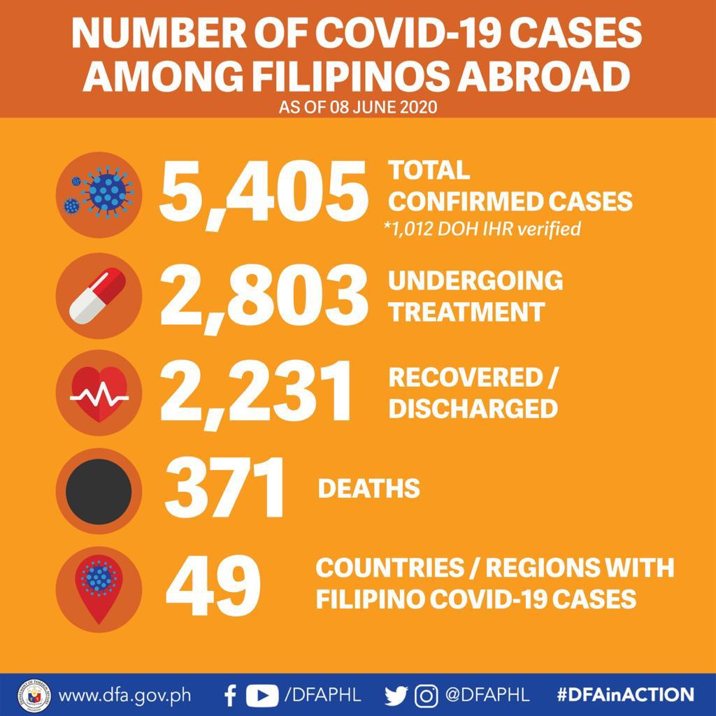 (Eagle News)–The Department of Foreign Affairs on Monday, June 8, said there were no new recoveries recorded today among overseas Filipinos who contracted the COVID-19 virus.