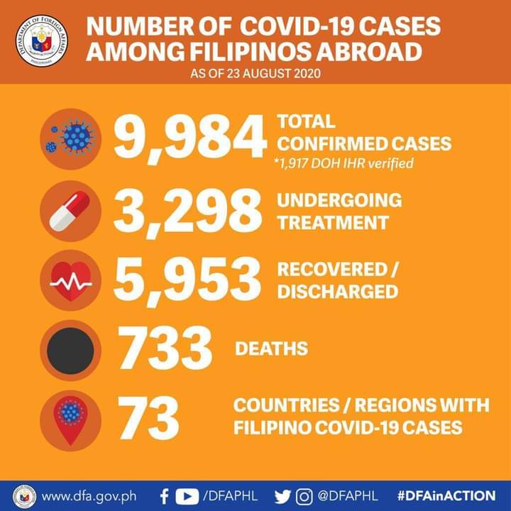 (Eagle News)–The Department of Foreign Affairs has reported one confirmed case of COVID-19 among overseas Filipinos, bringing the total to 9984.