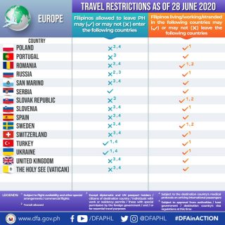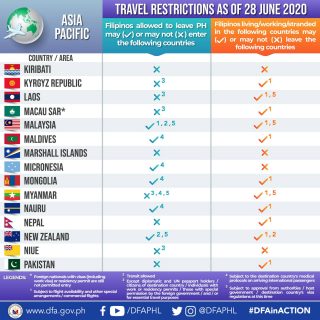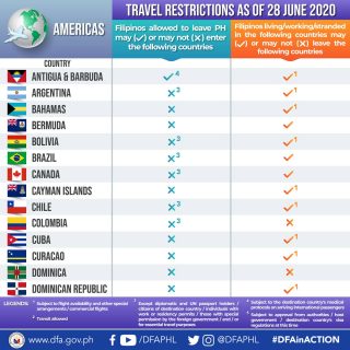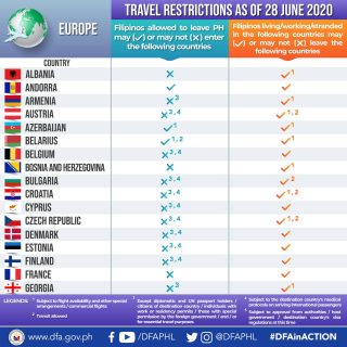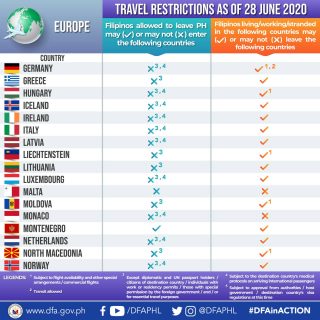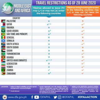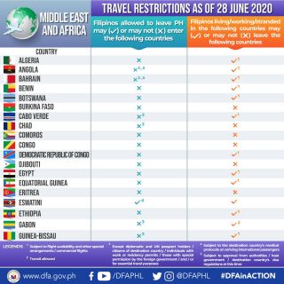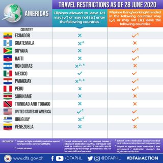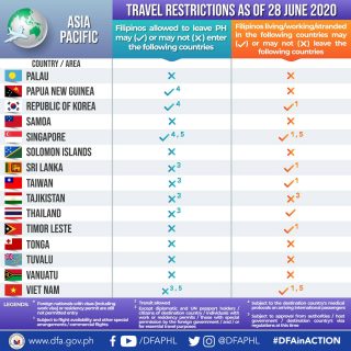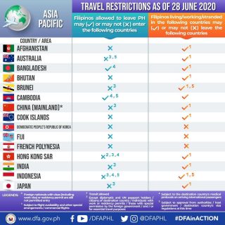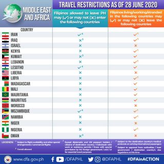 (Eagle News)–The Department of Foreign Affairs has released its updated list of travel bans and restrictions in countries around the world amid the COVID-19 pandemic.