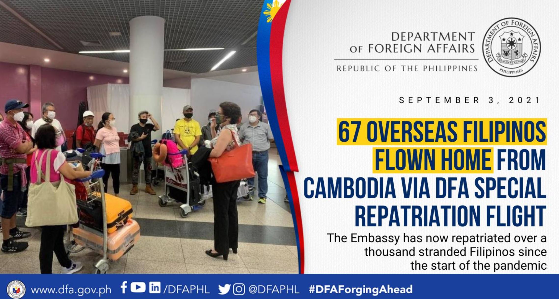 (Eagle News) — Sixty-seven Filipinos recently arrived in the Philippines after they were repatriated by the government from Cambodia.