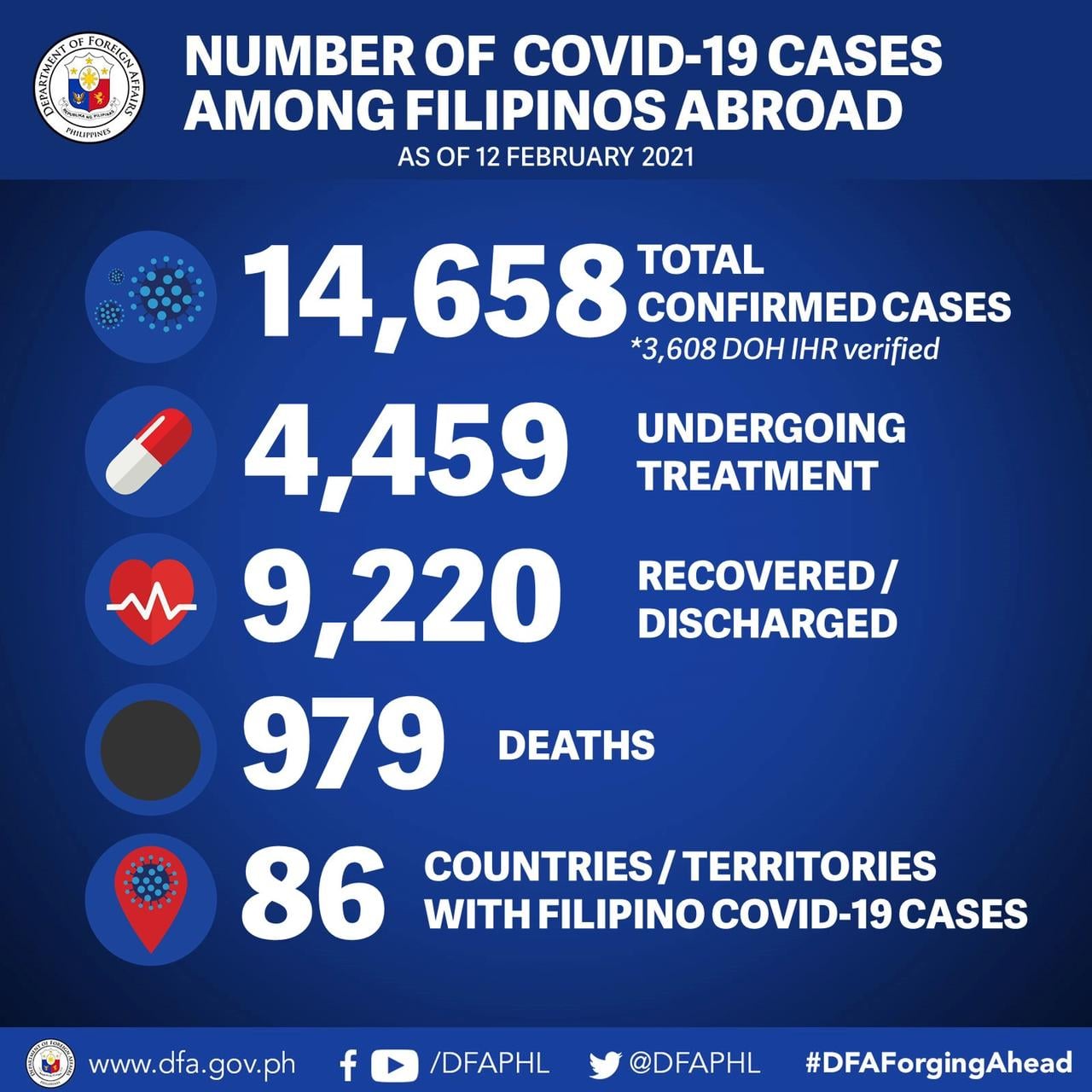 The Department of Foreign Affairs said the additional cases pushed the COVID-19 cases among Filipinos abroad to 14658.