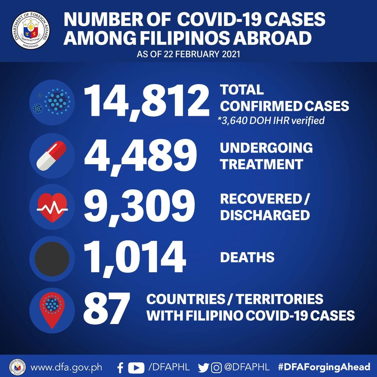 The Department of Foreign Affairs said the additional COVID-19 cases pushed the COVID-19 total among overseas Filipinos to 14812.