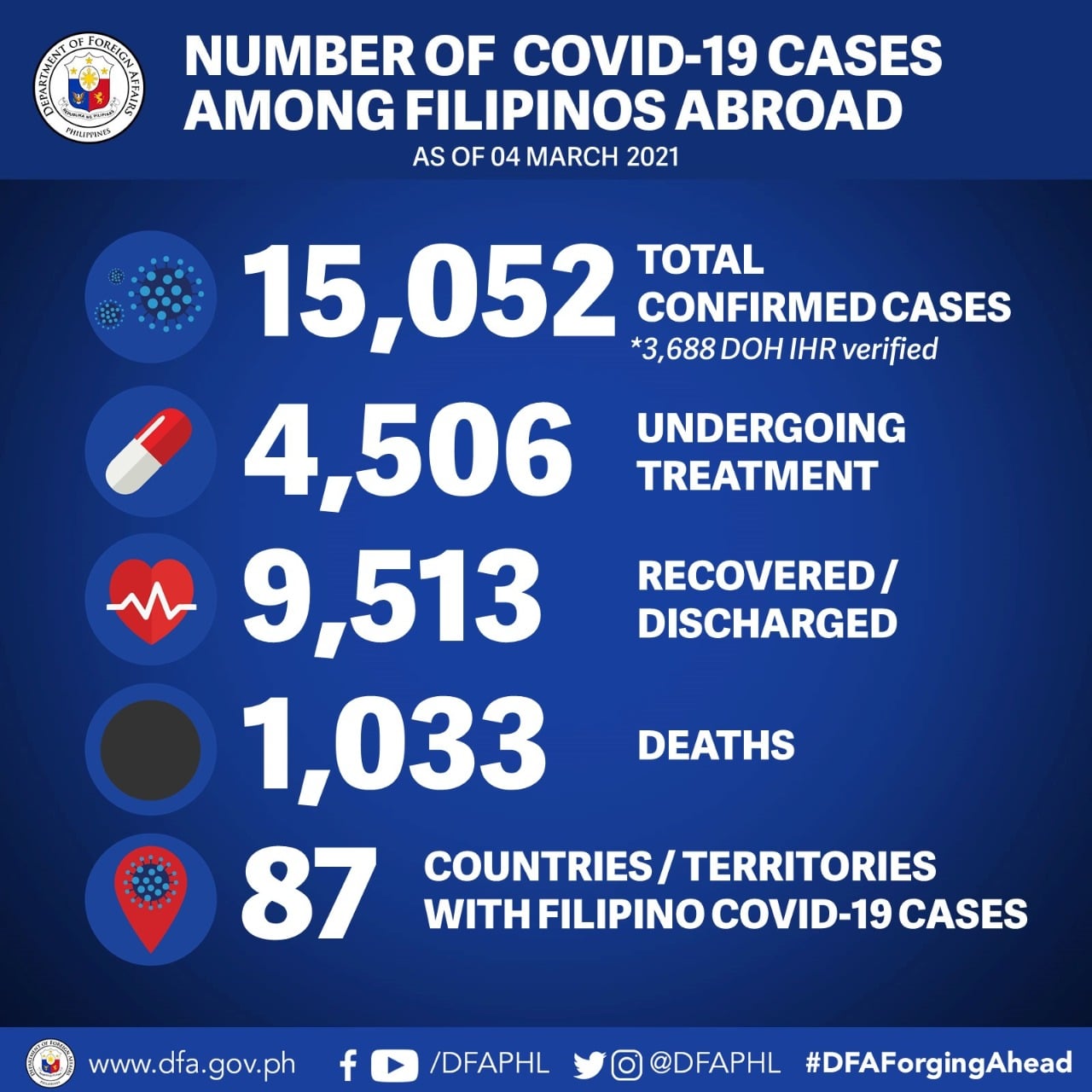 According to Department of Foreign Affairs data, the additional deaths pushed the COVID-19 death toll among Filipinos abroad to 1,033.
