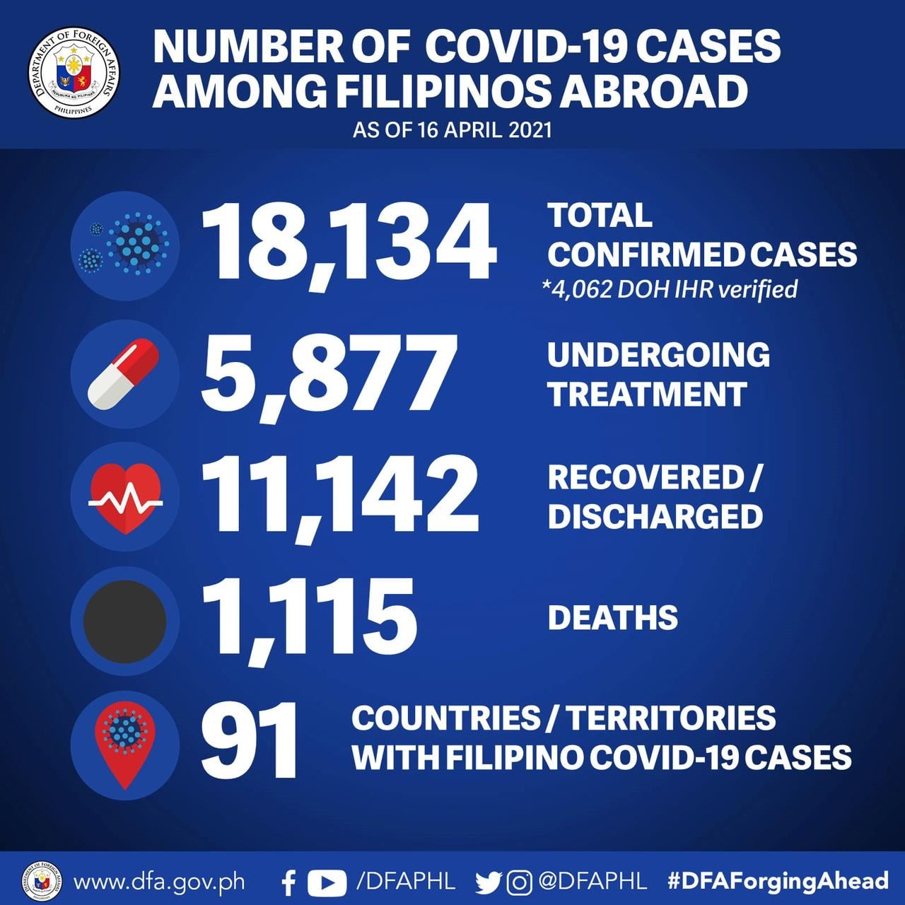 Data released by the Department of Foreign Affairs recently said the additional 126 COVID-19 cases pushed the COVID-19 cases among overseas Filipinos to 18,134.