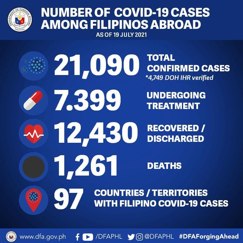 According to recent Department of Foreign Affairs data, the 147 more COVID-19 cases pushed the total cases among Filipinos abroad to 21090.