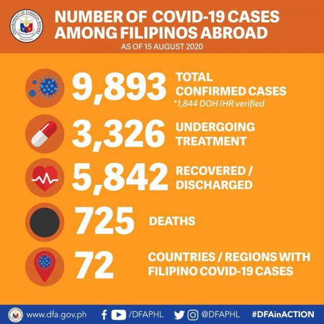 (Eagle News) — Fifteen new COVID-19 cases have been reported among overseas Filipinos, bringing the total to 9893, the Department of Foreign Affairs said.