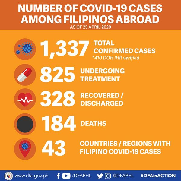 (Eagle News) – The Department of Foreign Affairs (DFA) reported 152 new COVID-19 cases involving overseas Filipinos, mostly from the Middle East, bringing the total number of confirmed cases to 1,337 as of Saturday, April 25.