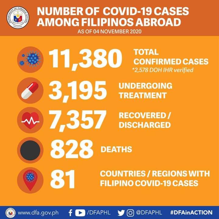 The Department of Foreign Affairs said with the addition, the COVID-19 tally of Filipinos abroad stands at 11380.