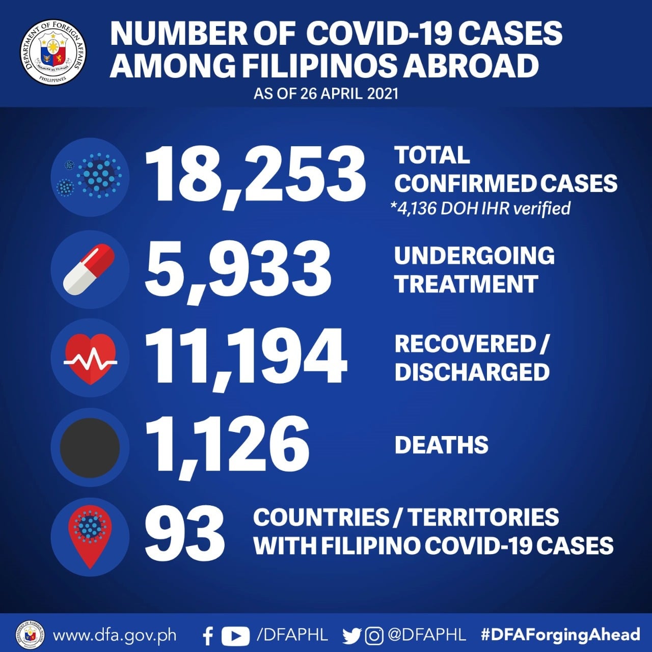 Recent Department of Foreign Affairs data showed the additional cases pushed the COVID-19 cases among Filipinos abroad to 18253.