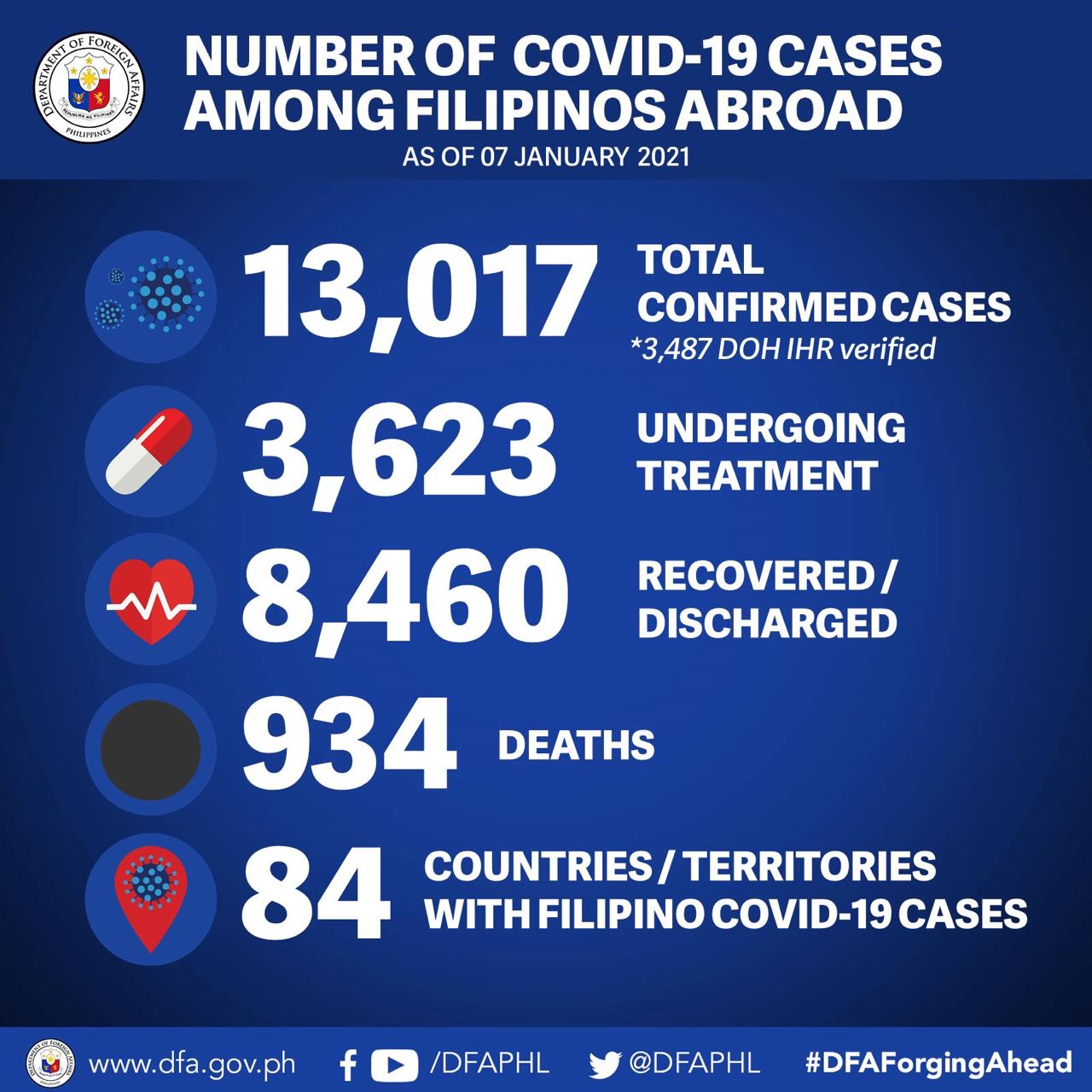 The Department of Foreign Affairs said the additional cases pushed the COVID-19 total among Filipinos abroad to 13017.