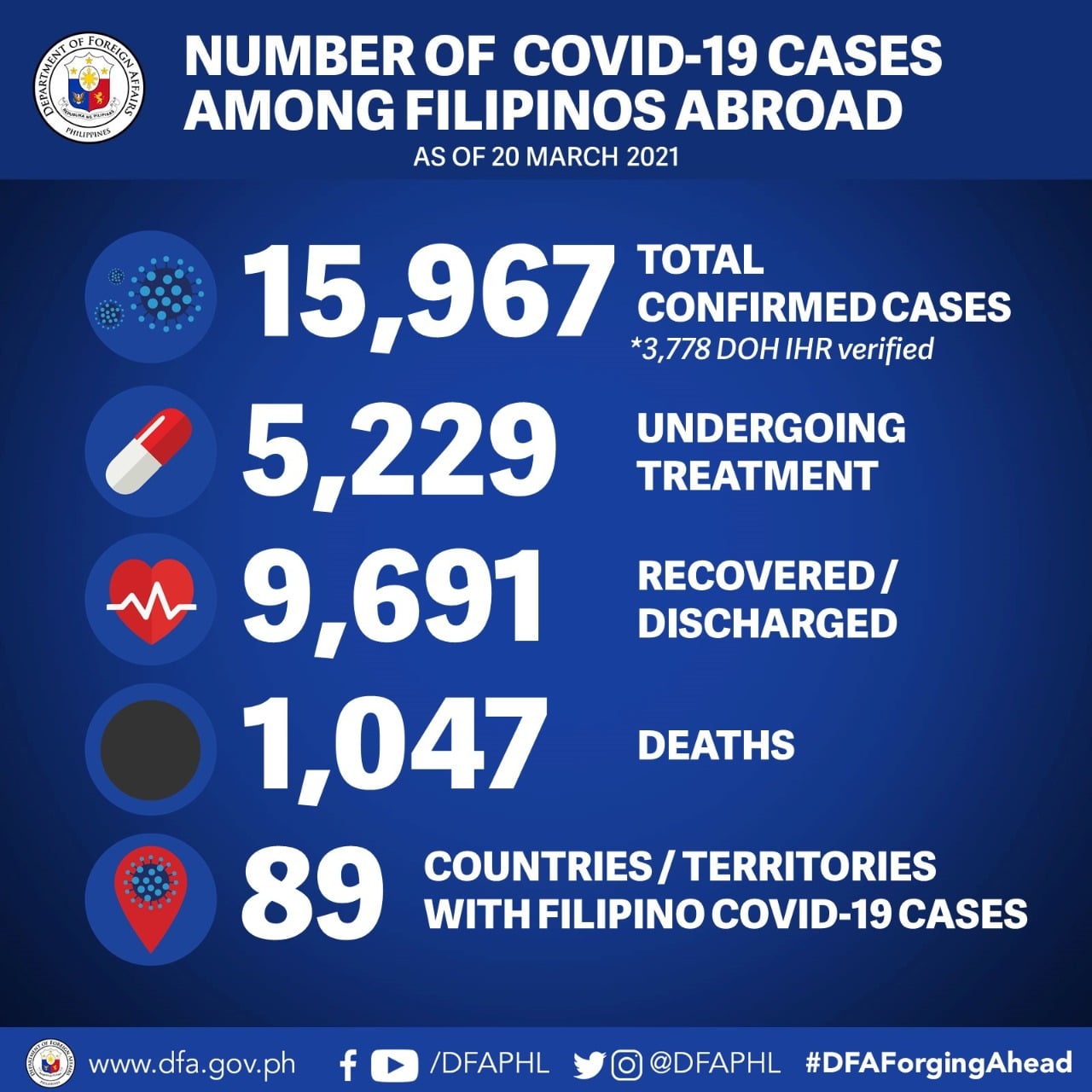According to recent Department of Foreign Affairs data, the additional cases pushed the COVID-19 cases among Filipinos abroad–whether active or not–to 15967.