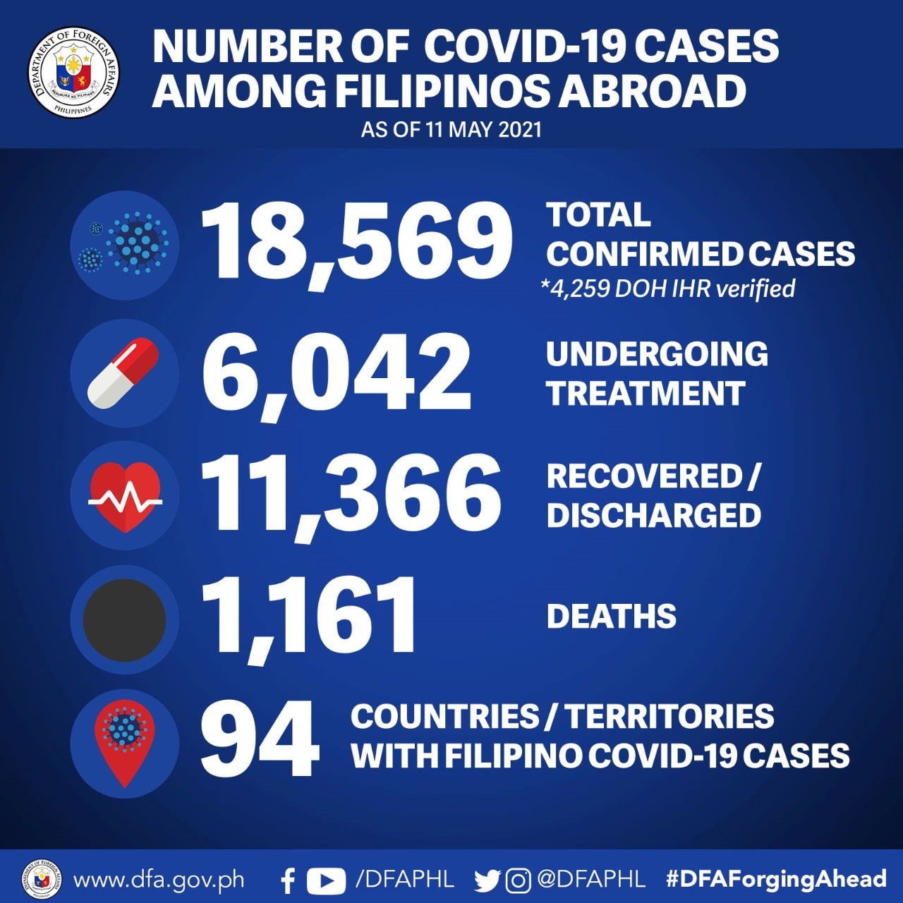 The Department of Foreign Affairs said the additional cases pushed the total COVID-19 cases among Filipinos abroad to 18569.