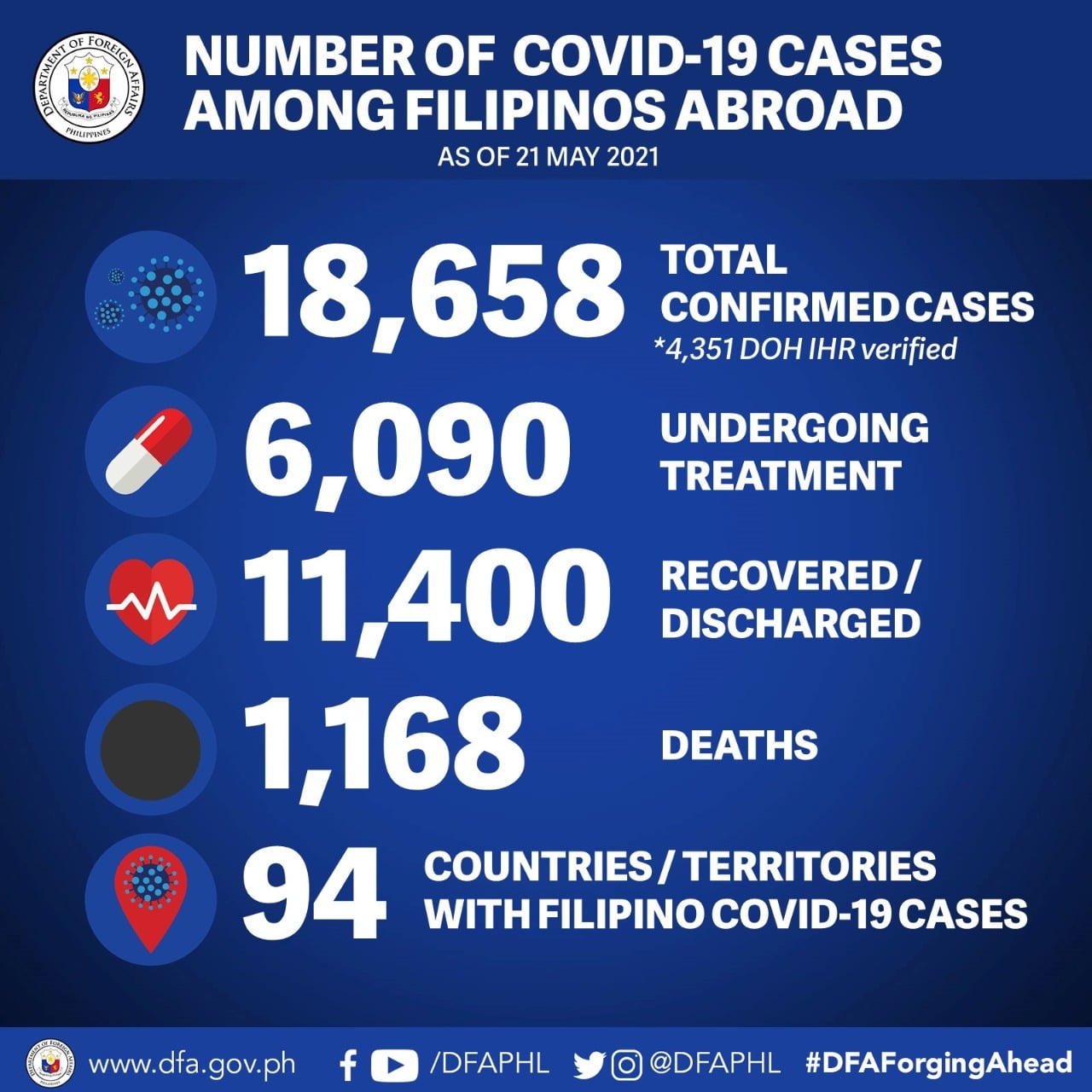 The Department of Foreign Affairs said the additional cases pushed the COVID-19 cases among Filipinos abroad to 18658.