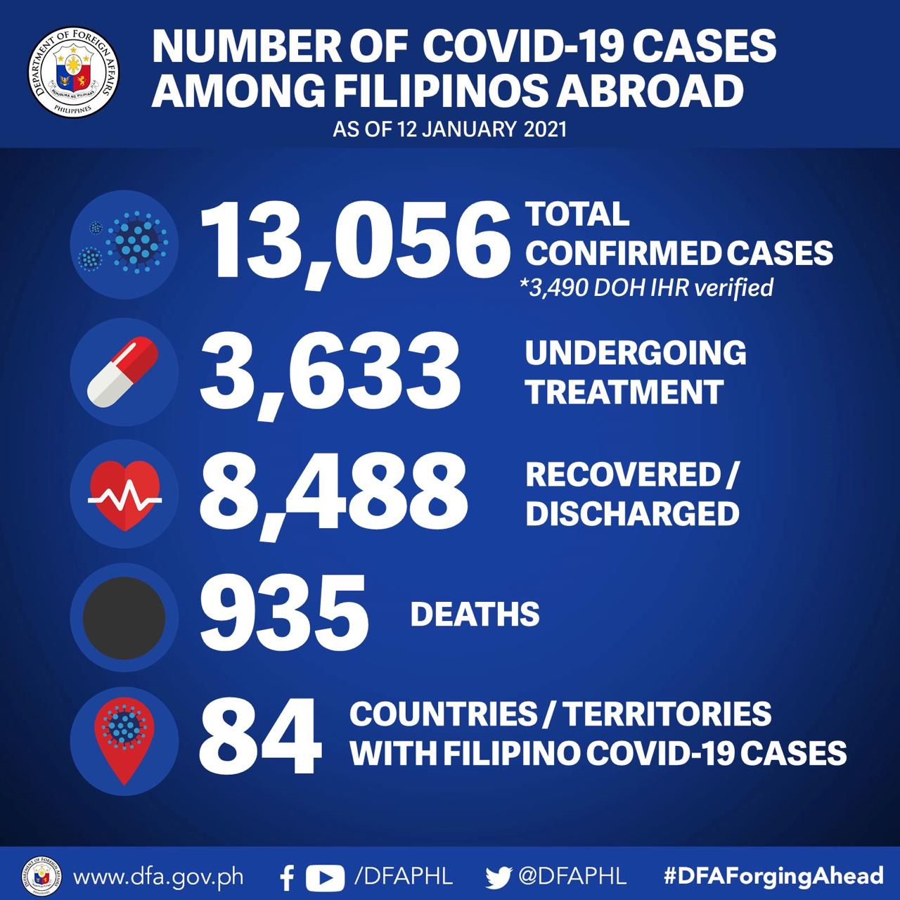 The Department of Foreign Affairs said with the additional cases, the COVID-19 total among Filipinos abroad rose to 13056.