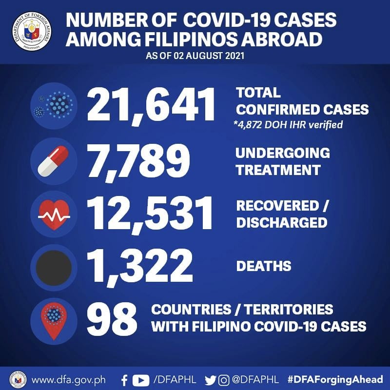 According to Department of Foreign Affairs data, the additional 503 cases pushed the total COVID-19 cases among overseas Filipinos to 21641.