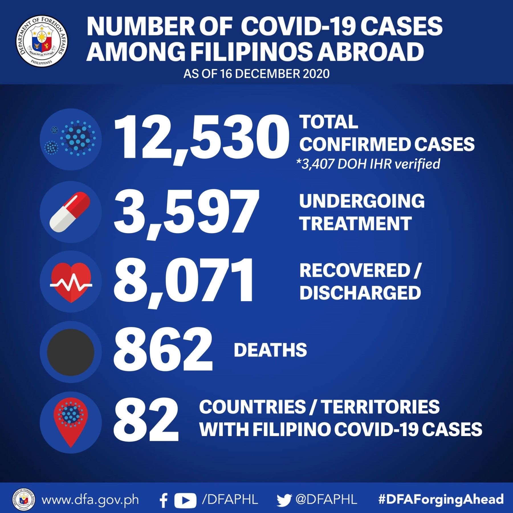 “To date, the total number of countries and territories with confirmed cases among Filipinos remains at 82,” the DFA said.