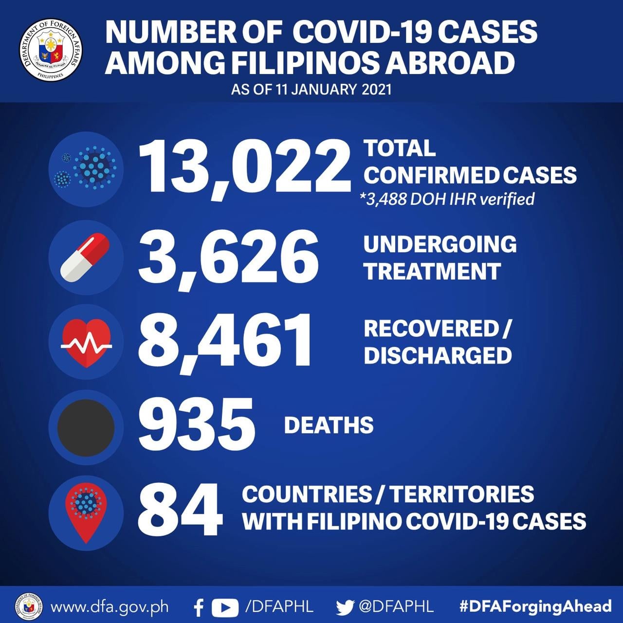 The Department of Foreign Affairs said the additional cases pushed the COVID-19 tally among Filipinos abroad to 13,022.