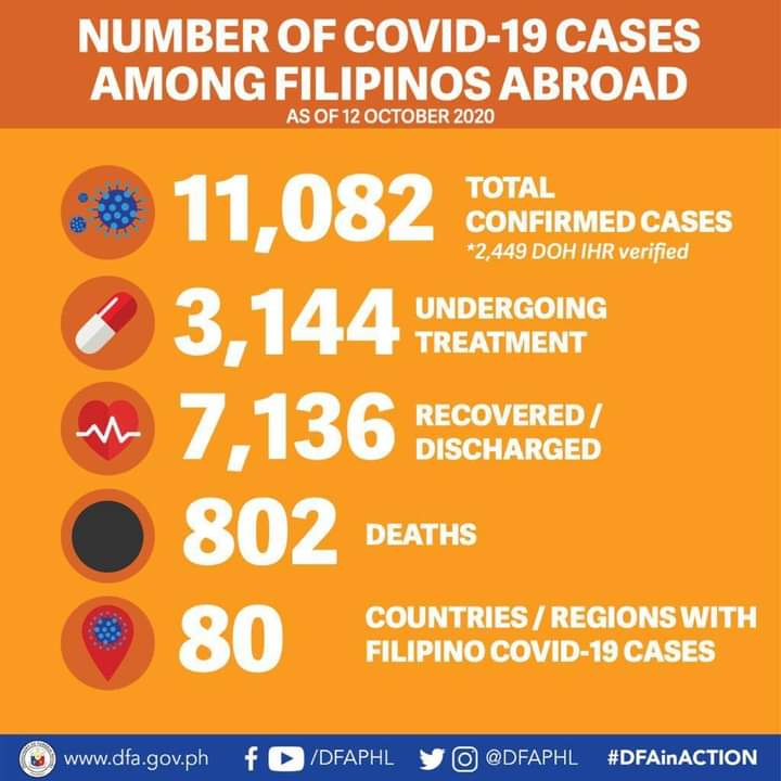 With the additional 213 cases, the COVID-19 tally among Filipinos abroad rose to 11082 as of October 12.