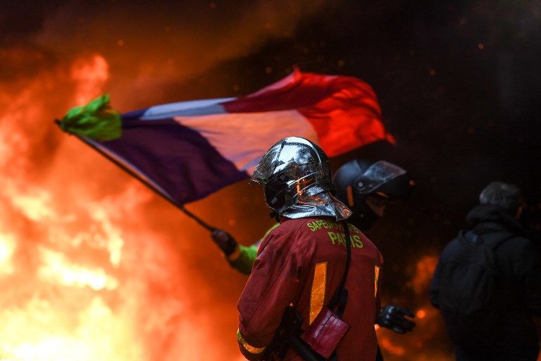 A French fire fighter walks towards flames as a Yellow vests (Gilets jaunes) demonstrator waves the French flag during protests against rising oil prices and living costs in the French capital Paris on December 1, 2018. – Groups of masked protesters battled police through clouds of tear gas near Paris’ Champs Elysees as thousands took part in a third weekend of “yellow vest” demonstrations, which have morphed from anger over fuel taxes into a broader anti-government movement. (Photo by Alain JOCARD / AFP)