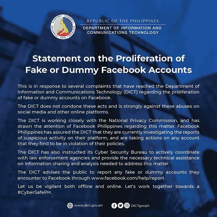 “Facebook Philippines has assured the DICT that they are investigating the reports of suspicious activity on their platform and are taking actions on any account that they find to be in violation of their policies,” DICT said.