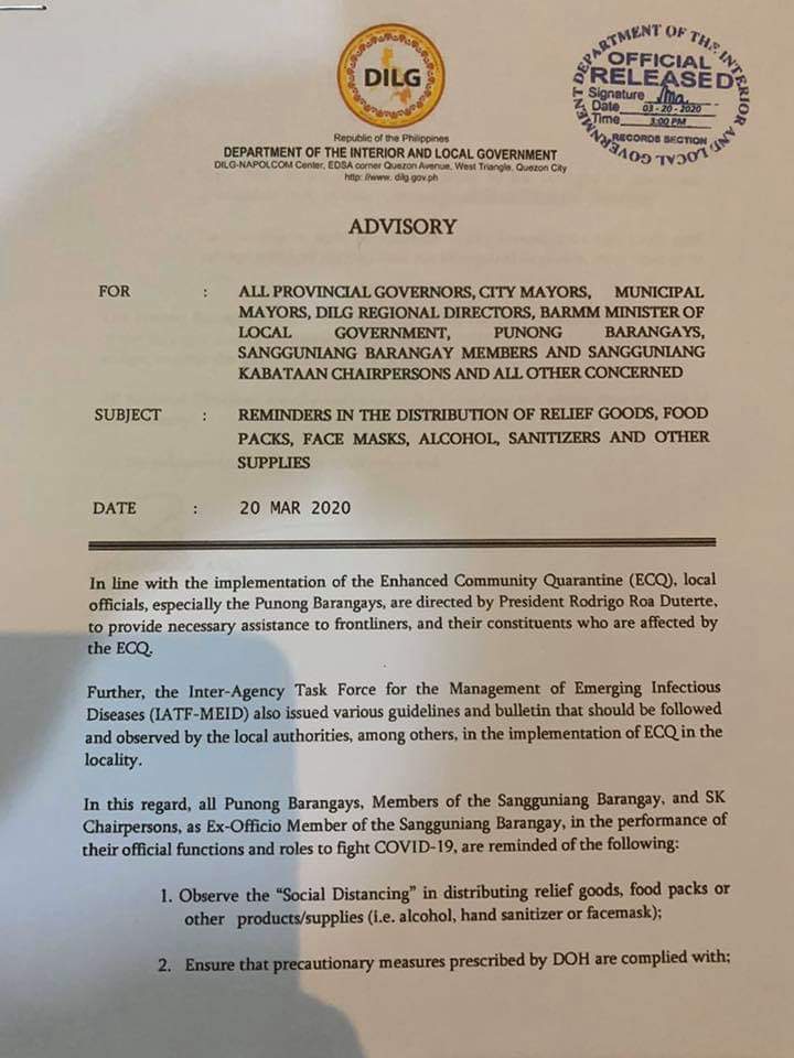 He also reminded LGUs to observe social distancing in the distribution of relief goods.