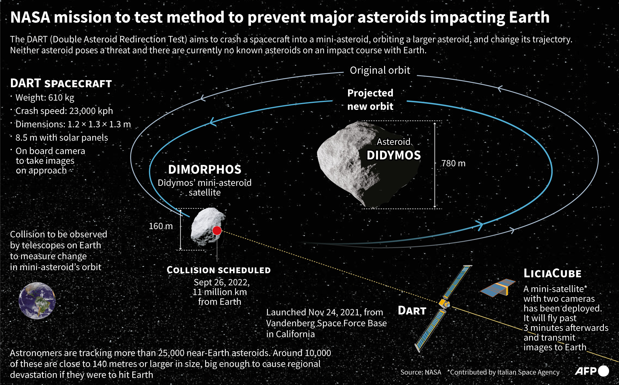 Laurel, United States (AFP) — NASA’s DART mission to test deflecting an asteroid using “kinetic impact” with a spaceship is just one way to defend planet Earth from an approaching object — and for now, the only method possible with current technology.