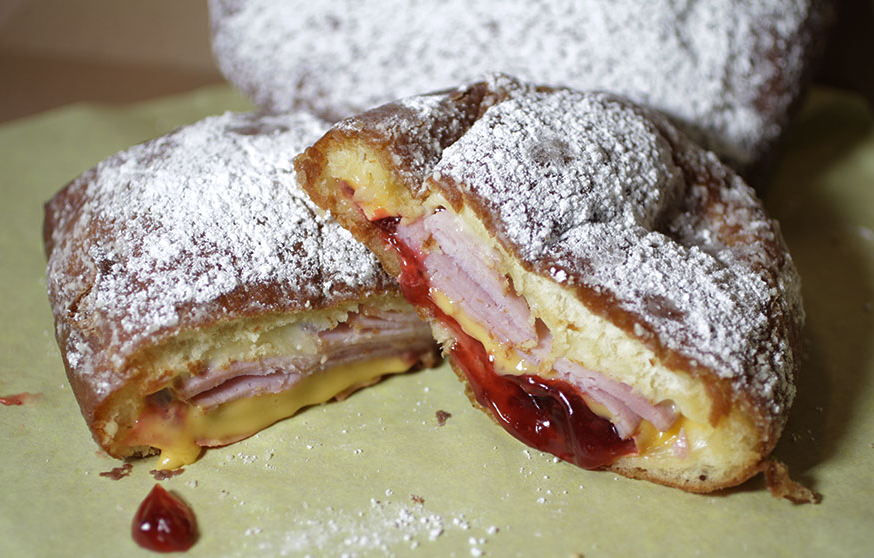 The second one would be the “Monte Cristo” Doughnut which has this kind of literally combined sweet and savoury flavour of ham, melted cheese and strawberry jam sandwiched between two halves of a glazed doughnut [sounds like heaven!]