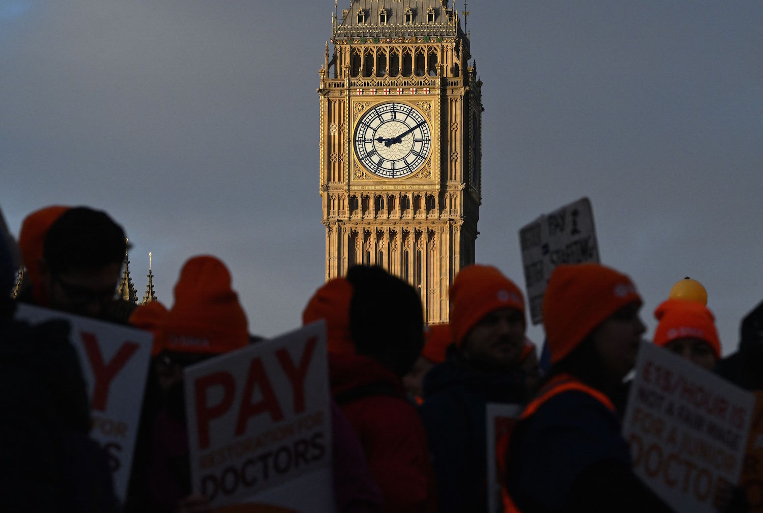 On a picket line outside St Thomas’ Hospital, across the River Thames from the UK parliament in London, medics held up signs calling for better funding for the overstretched health service.