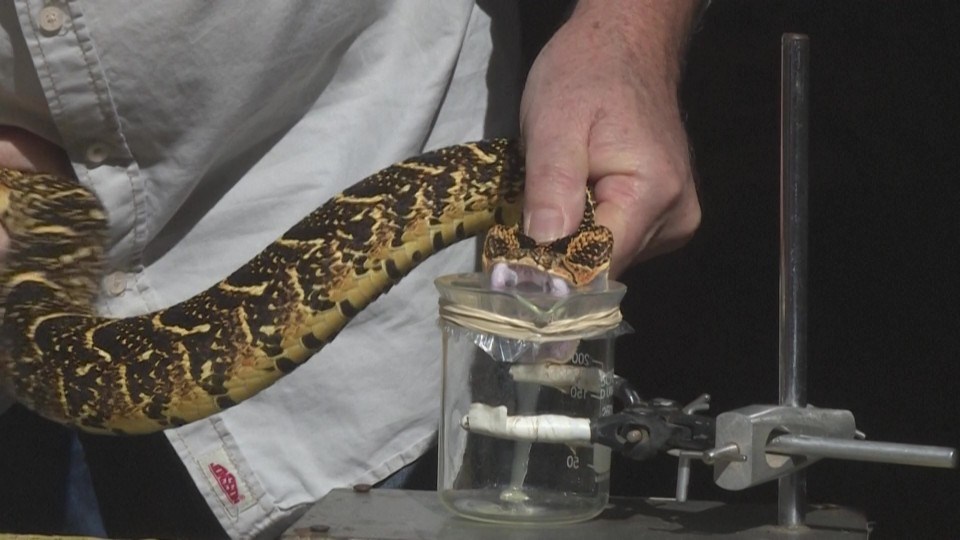 He said his team forces the hissing reptiles to spit out their poison by forcing them to bite a glass jar.
