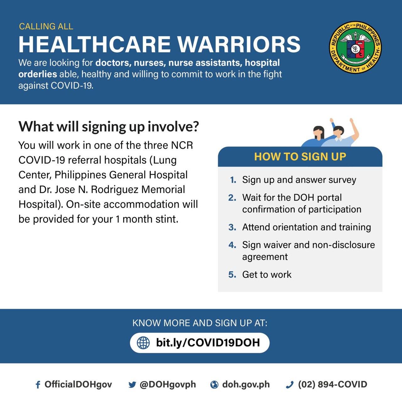 “We are looking for doctors, nurses, nurse assistants, hospital orderlies able, healthy and willing to commit to work in the fight against COVID-19”, the DOH said in a call for action posted on its official FB page.