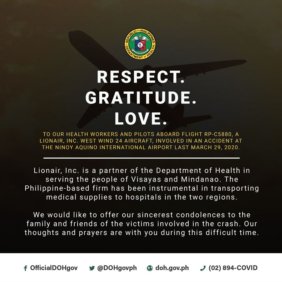 (Eagle News) — The Department of Health on Monday, March 30, expressed its condolences to loved ones of the people on board a Lionair Inc. plane that crashed as it was on its way to Japan for a medical evacuation mission.